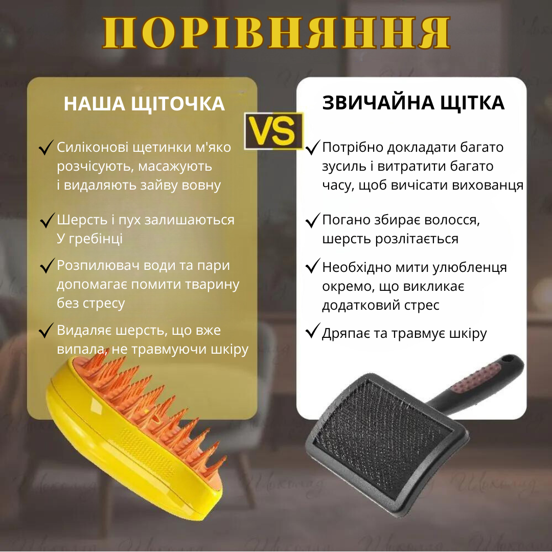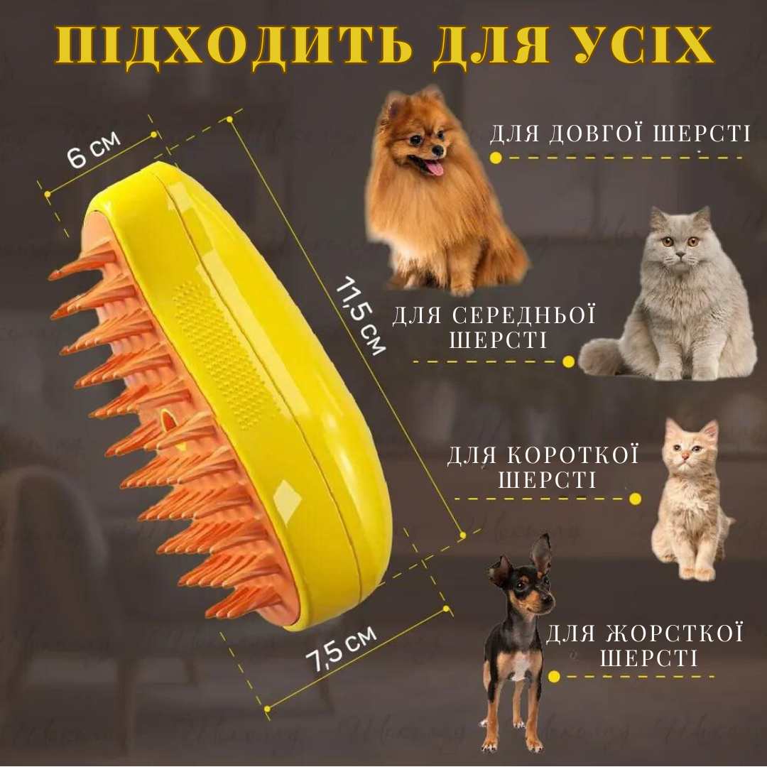 Особливість нашої моделі – електричний відпарювач, який забезпечує ефективний догляд за вашими улюбленцями. Завдяки впливу води і пари кожне волосся насичується вологою і стає гладким і зволоженим, а ще це забезпечує освіжаючий ефект і допомагає розплутувати грудки і ковтуни. Особливо це актуально для довгошерстих порід собак (такі як шелті, йорки, стефан і померанські шпіци, коргі, бордер-коллі, пуделі, ньюфаундленди, пікінеси,) і кішок (такі як британці, бобтейли, сибірські, мейн-куни, персид). Підійде щітка-гребінець і для вичісування короткошерстих порід: йоркширських тер’єрів, той тер’єра, болонок та вівчарок, джек рассел, китайської хохлатої).